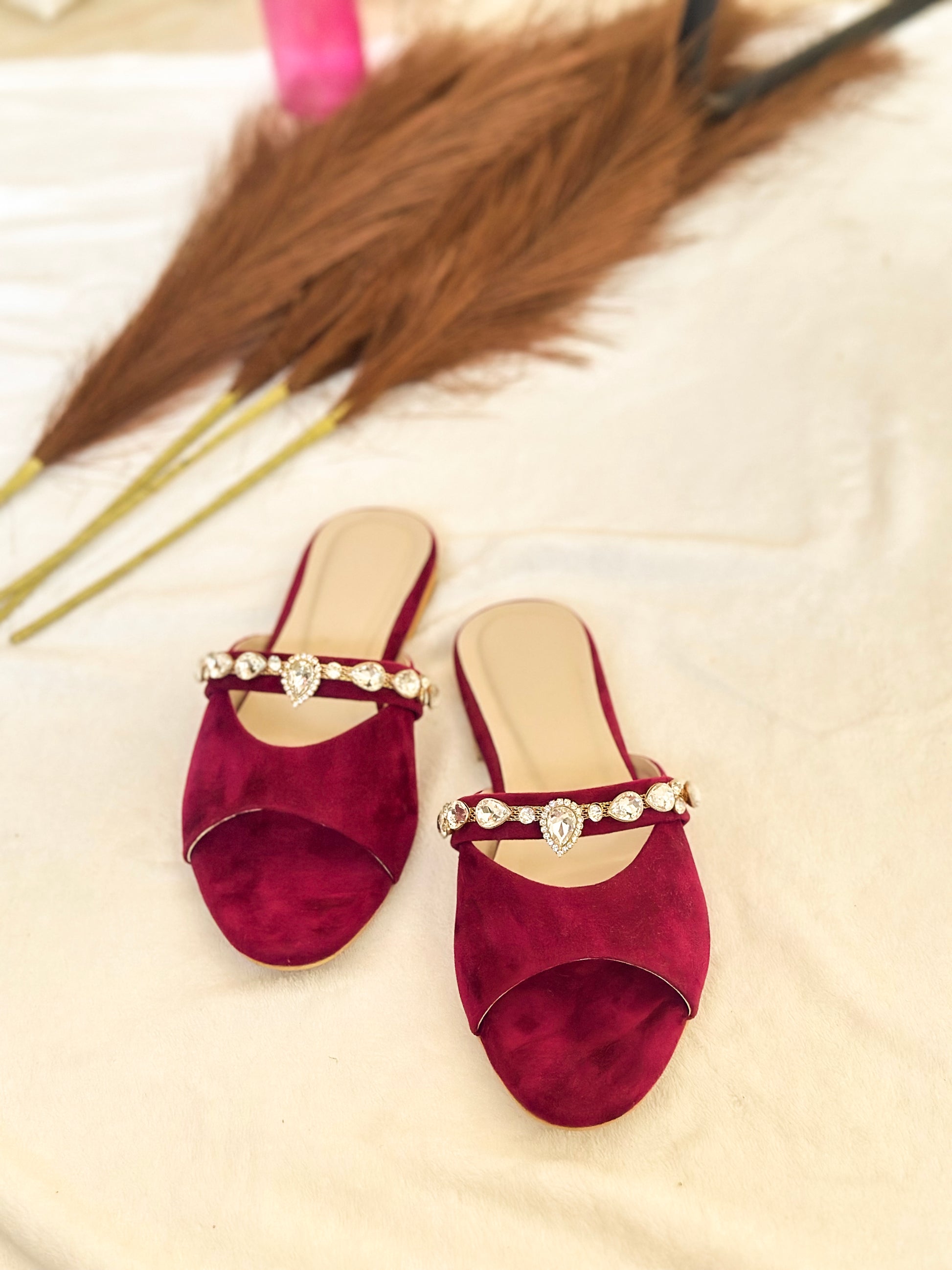 Refined and regal, these wine velvet flats combine plush comfort with dazzling accents — perfect for formal gatherings or chic evenings.
